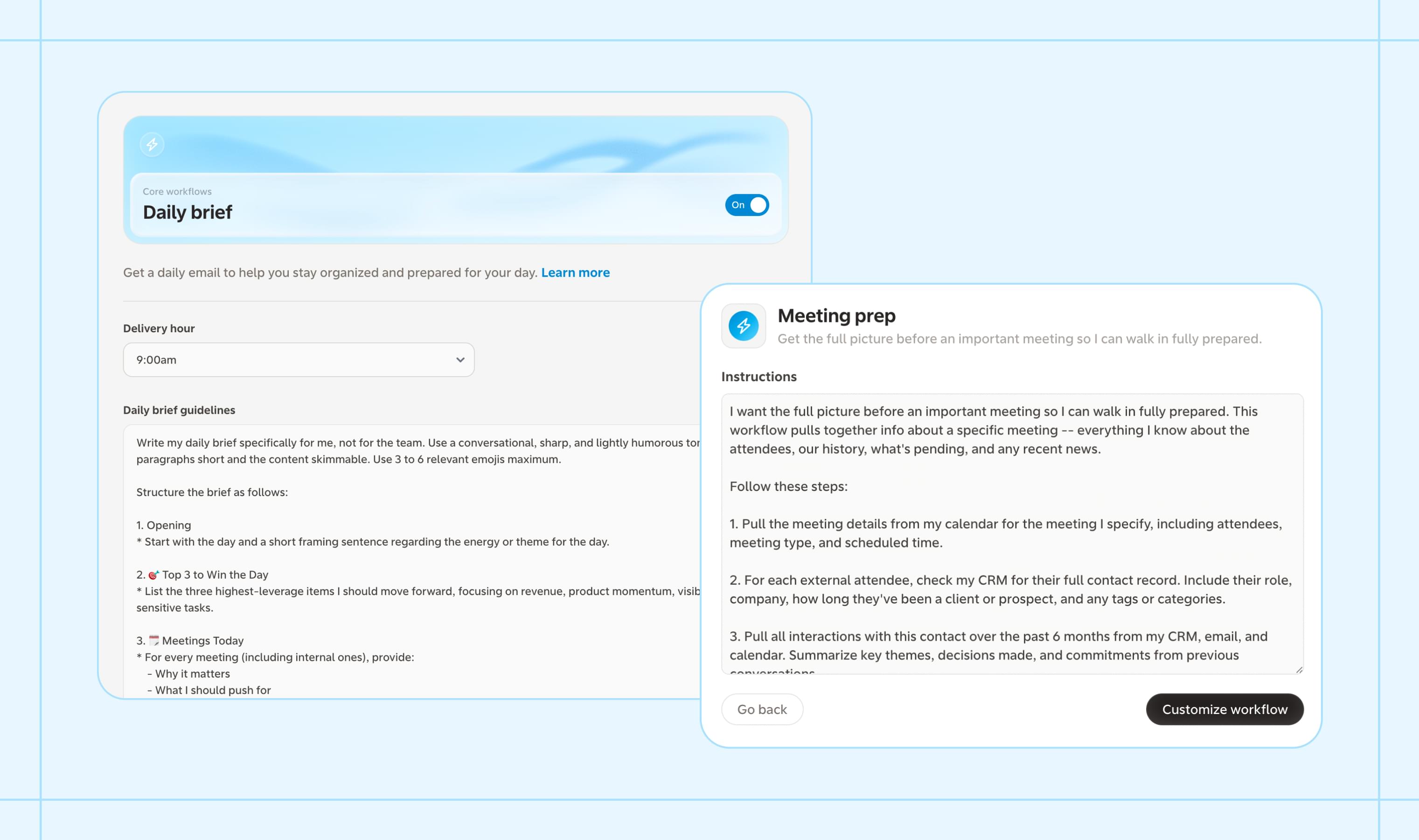 The daily brief is one of Quin's core workflows, so it's already in your account. Go to Workflows, open the Daily Brief, and adjust the settings to fit how you start your day: what time you want it delivered, which meetings to include context for, and what standing items matter to you each morning.